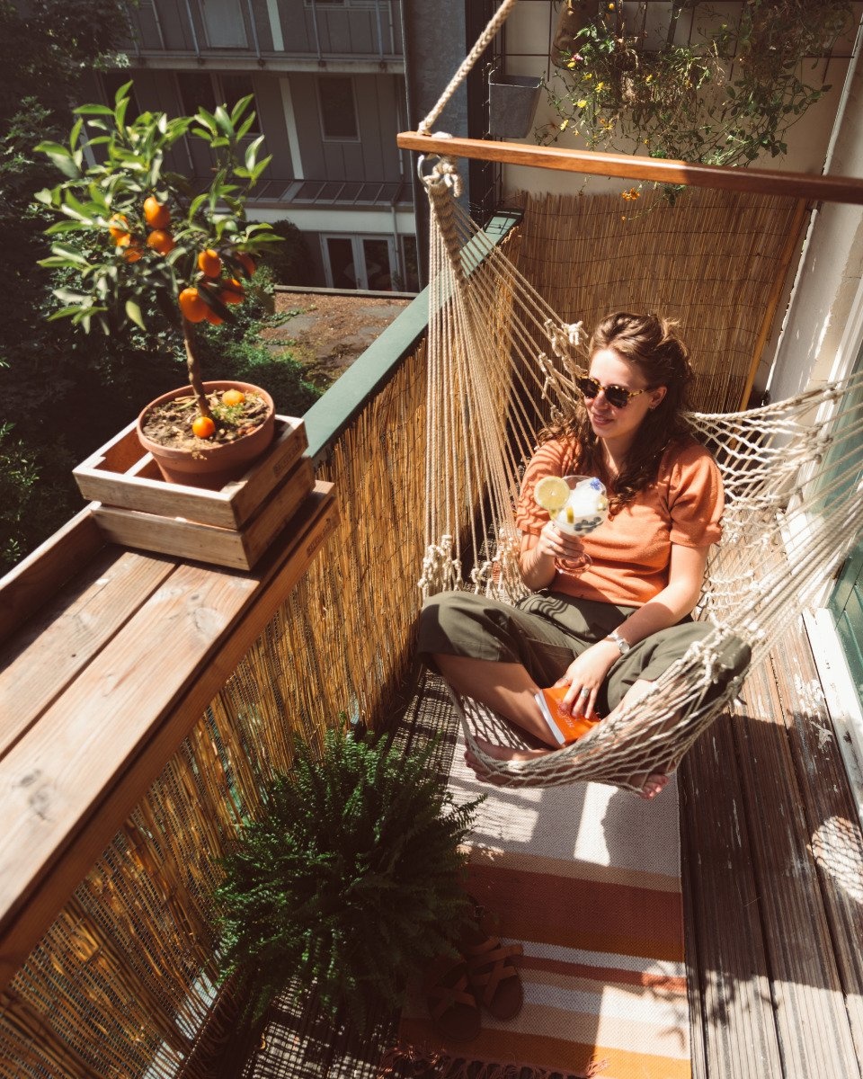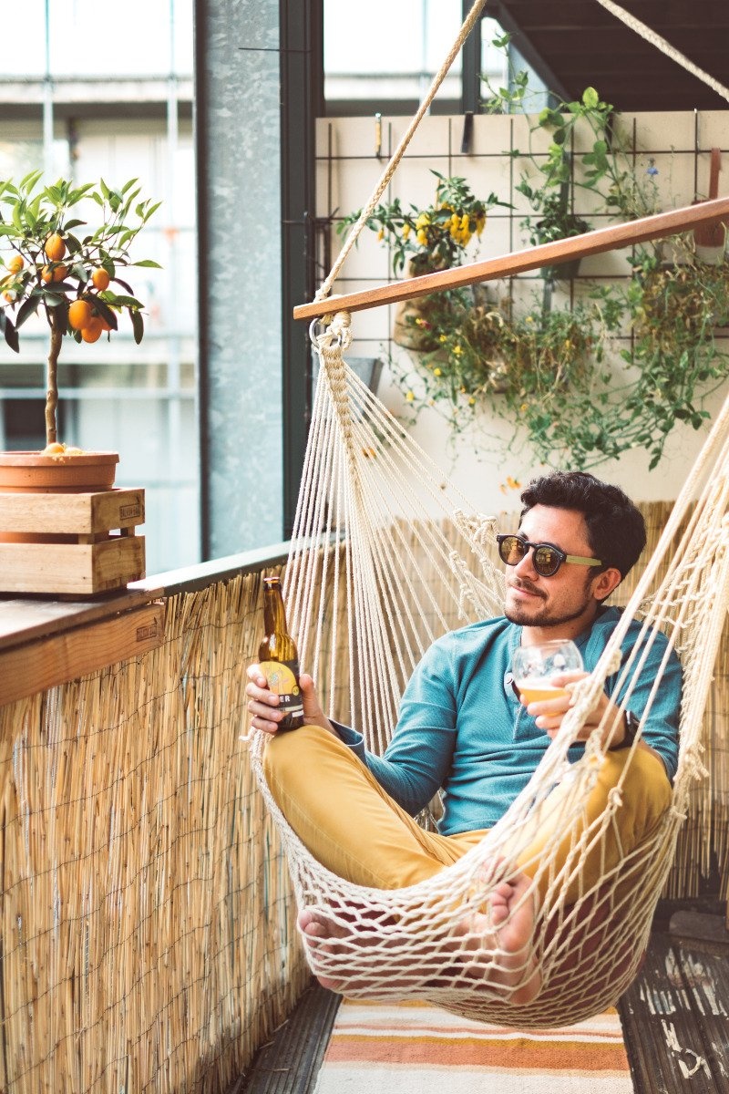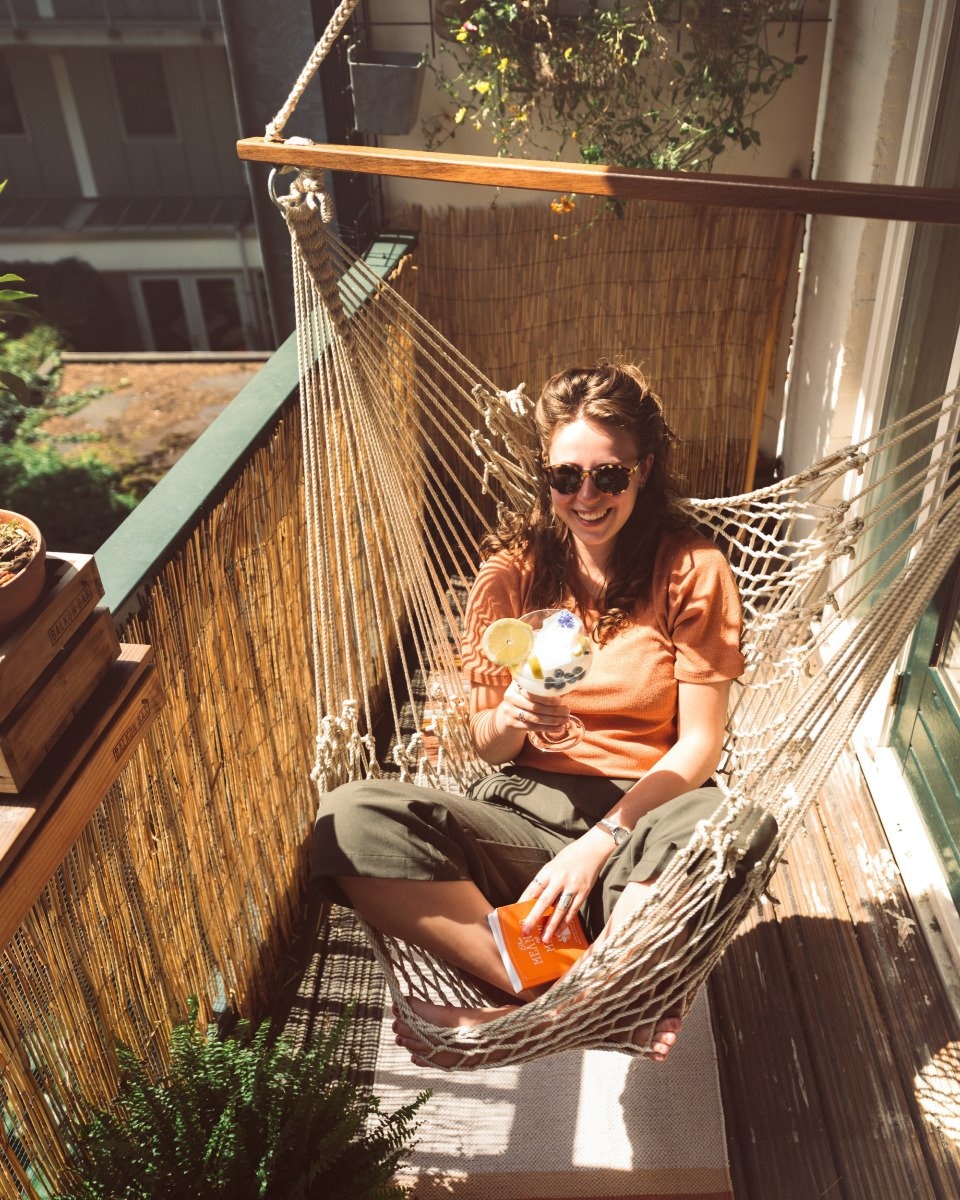 Een ervaren medewerker is bijna een volledige dag bezig om de hangstoel te vlechten.De gerecyclede polyester touwen waarmee de hangstoel wordt gevlochten zijn zeer goed bestand tegen de weersinvloeden.