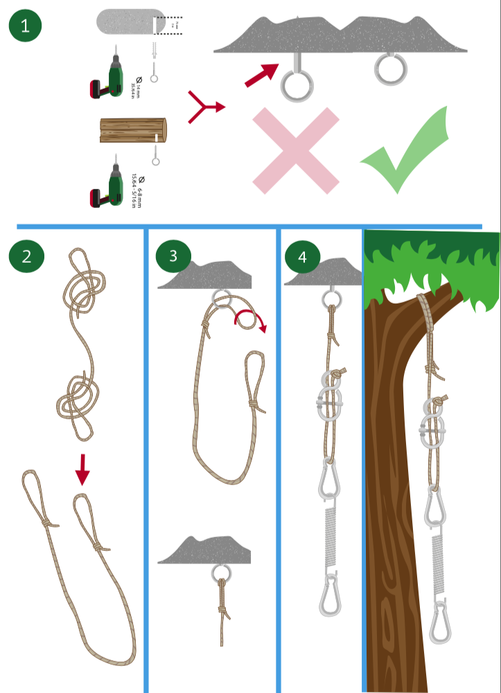 Boren of toch knopen? Kies voor de "Complete" met oogschroeven en pluggen wanneer je de hangmat of hangstoel graag in een muur, plafond of balk wilt bevestigen.Kies voor de "Simple" zonder de oogschroeven en pluggen wanneer je een muur of balk hebt waar je het touw omheen kan knopen.