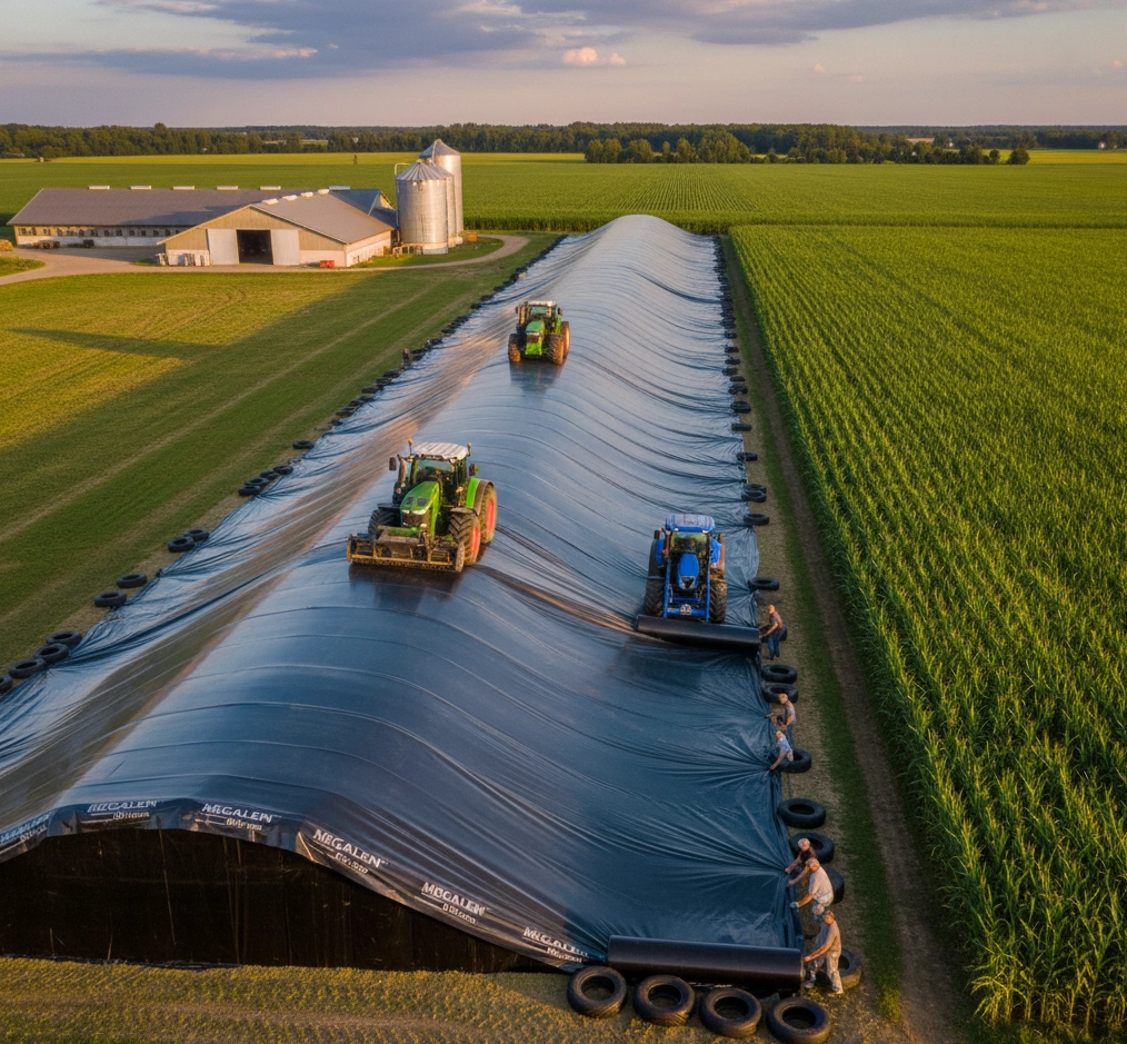 • Waterdichtheid: het materiaal is volledig waterdicht, wat cruciaal is om kuilvoer, zoals mais,  droog te houden en het binnendringen van regenwater te voorkomen.