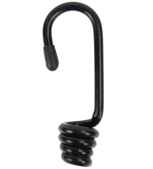 Gemaakt van gehard staal en voorzien van een kunststof coating. Deze haak is geschikt voor een elastiek of trapezekoord van 8 mm.