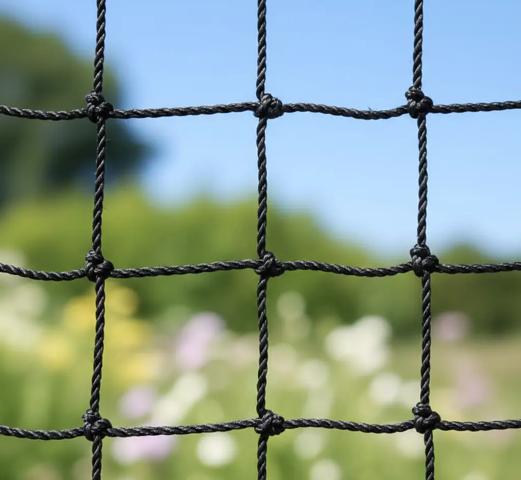 Vijvernet op maat gemaakt per M2, in dit geval een vierkante maas met een wijdte van 1.5 cm x 1.5 cm. Deze netten hebben een 8mm dik randkoord. Gemaakt van een UV gestabiliseerde 1,3mm dikke polyethyleen draad in de kleur zwart.
